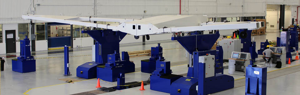 Electroimpact developed a state-of-the-art automated positioning system (APS) for the Bombardier Global 7000/8000 final assembly line (FAL). The FAL consists of three work centers: wing-to-wing join, joined wing to center fuselage join, and forward and aft fuselage join. Within each work center are precisely coordinated multi-axis manipulators complimented by an integrated metrology system.